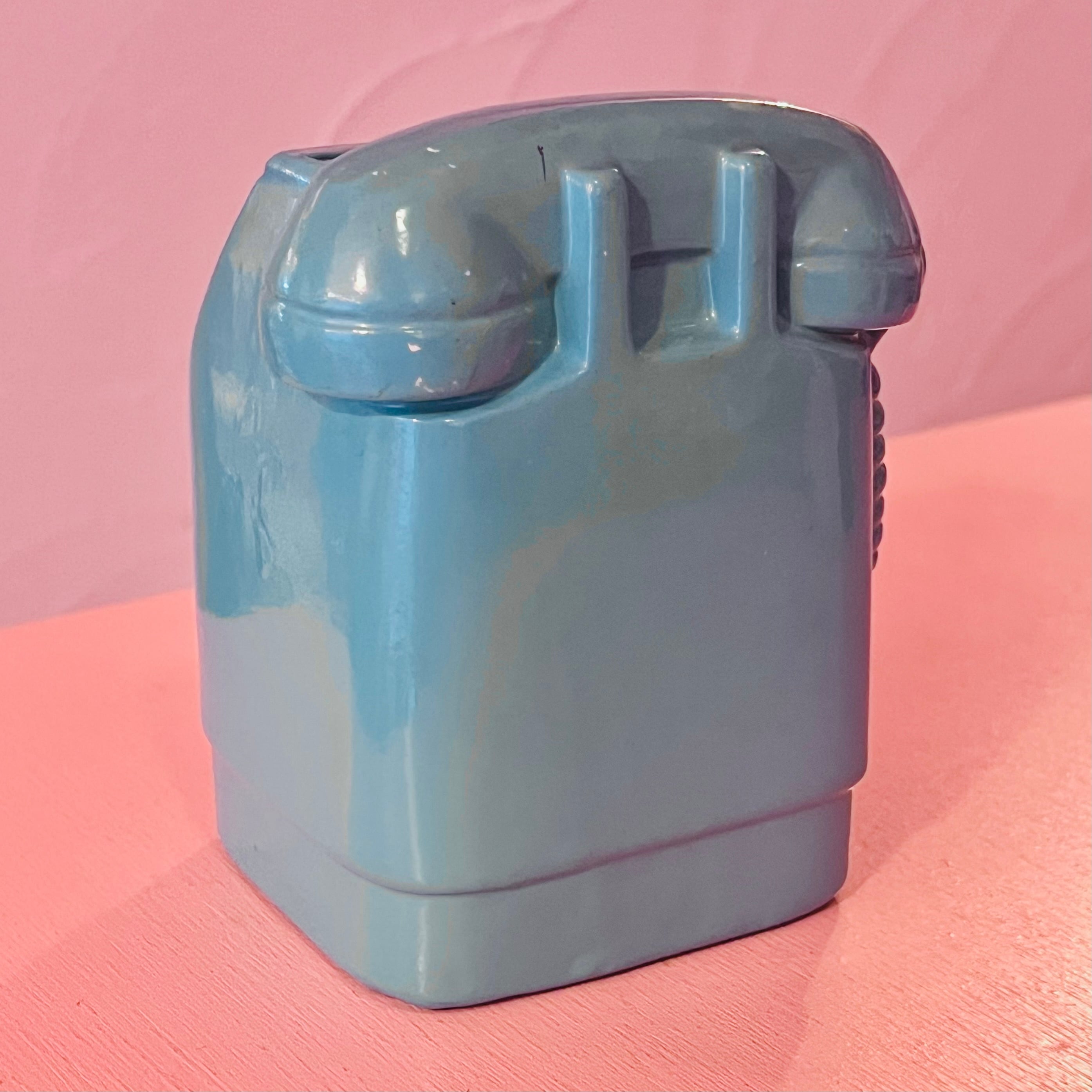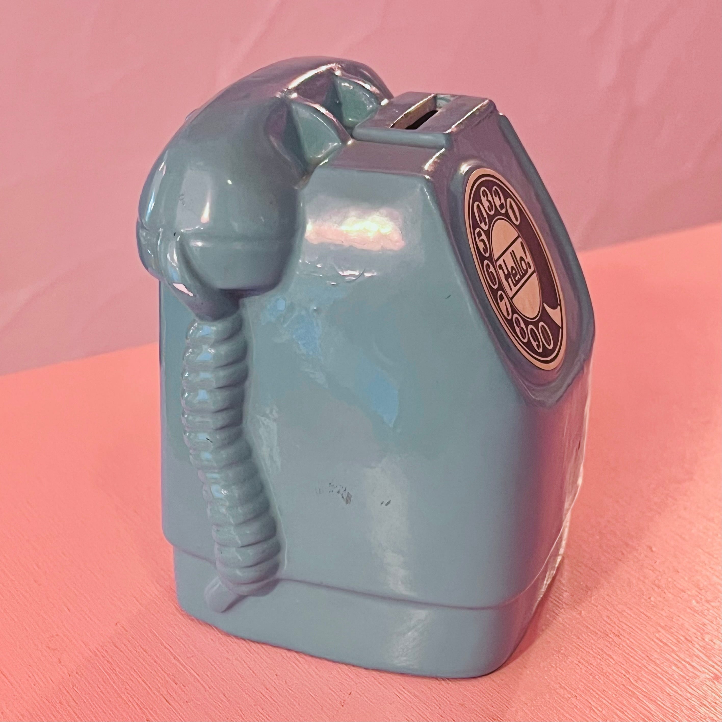 鮮やかな水色が素敵!ポップでファンシーな電話型の貯金箱♪陶器製です。