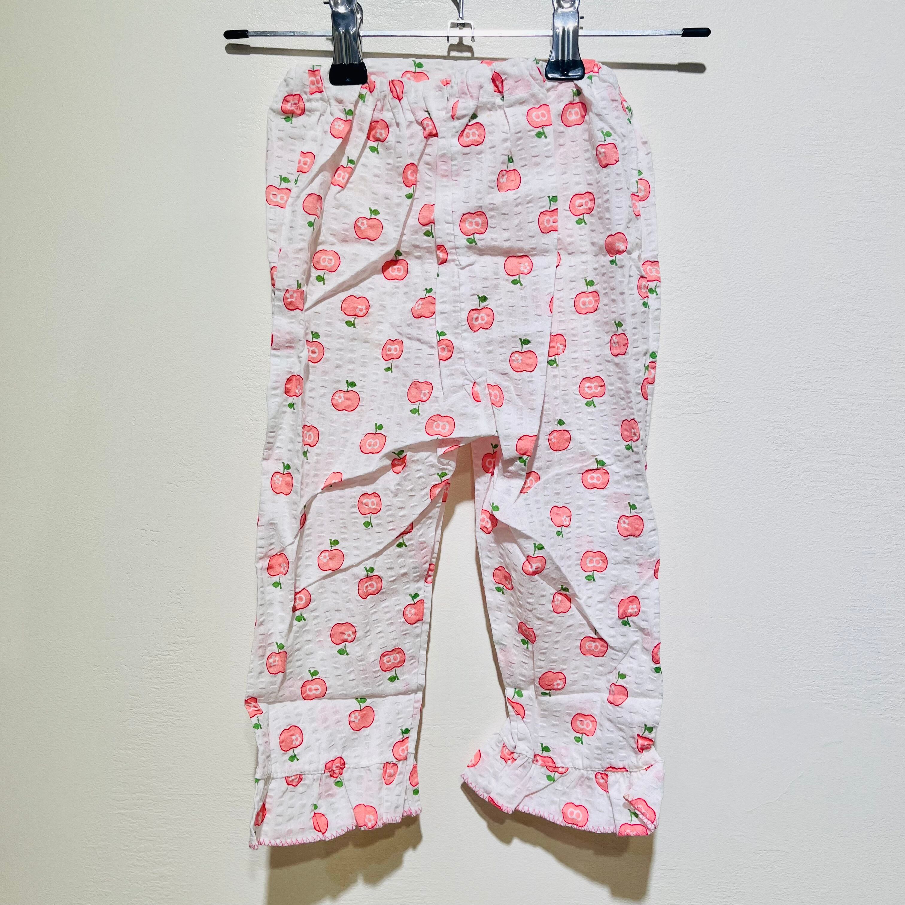りんごとお花の模様がとても可愛いこども用パジャマ。シャツはインしてズボンにボタンでくっつける形です。