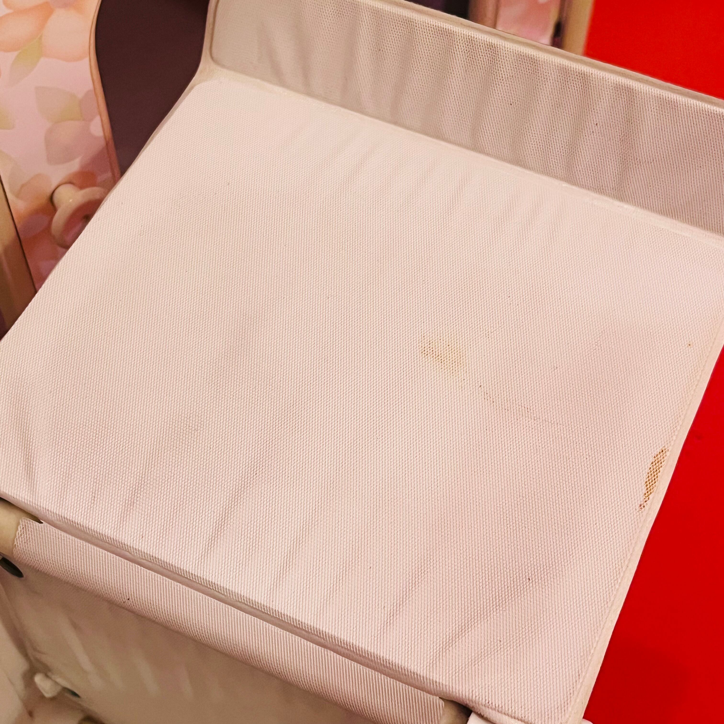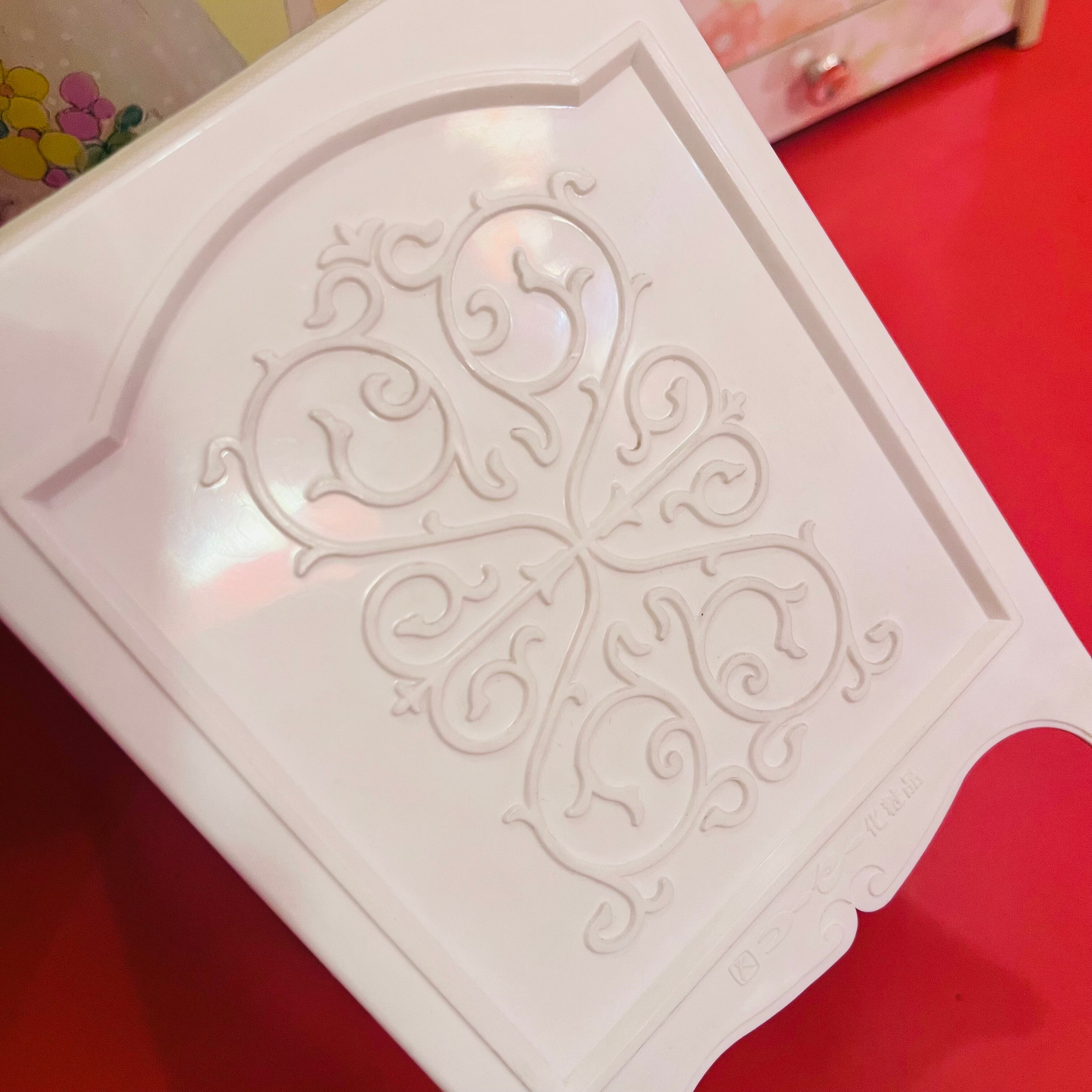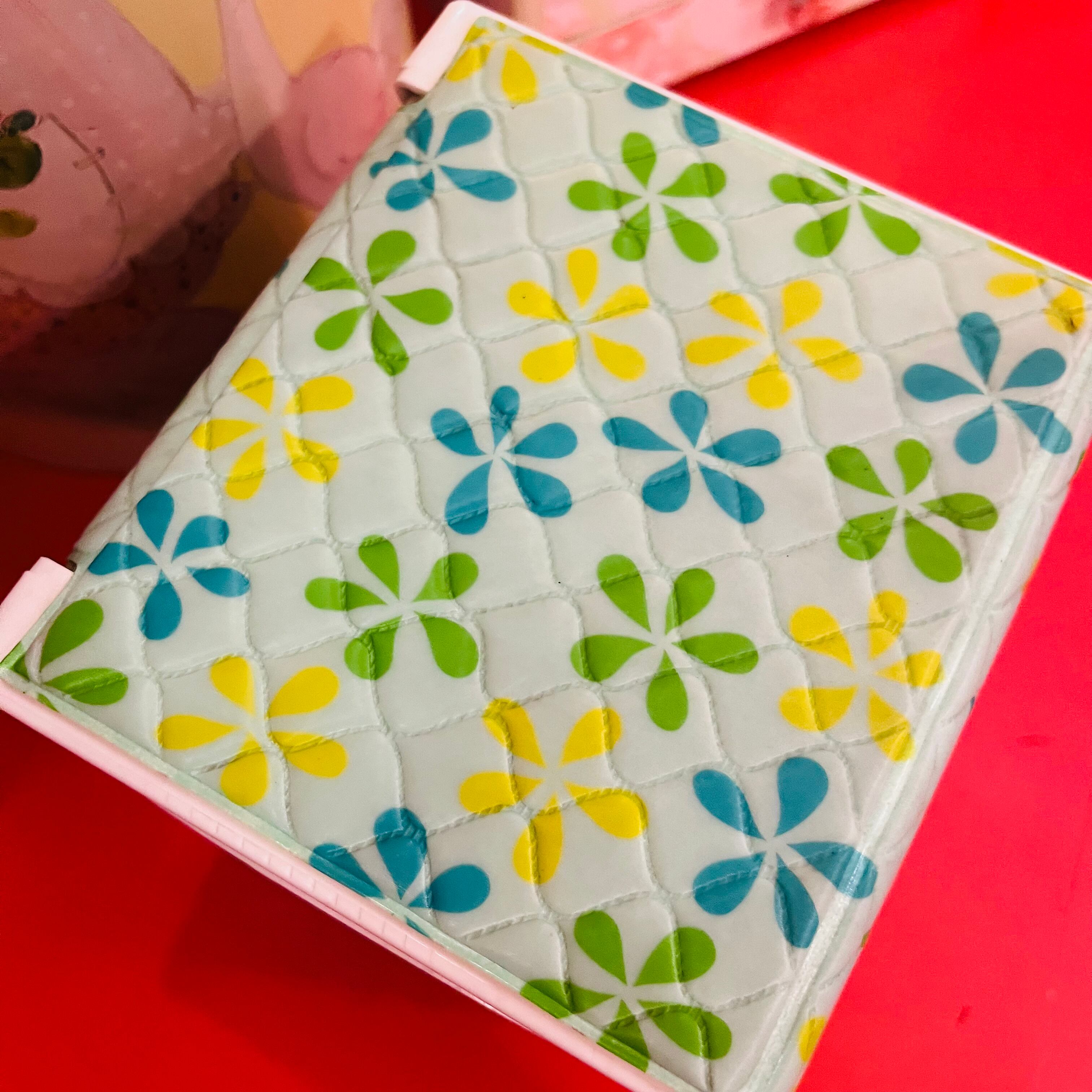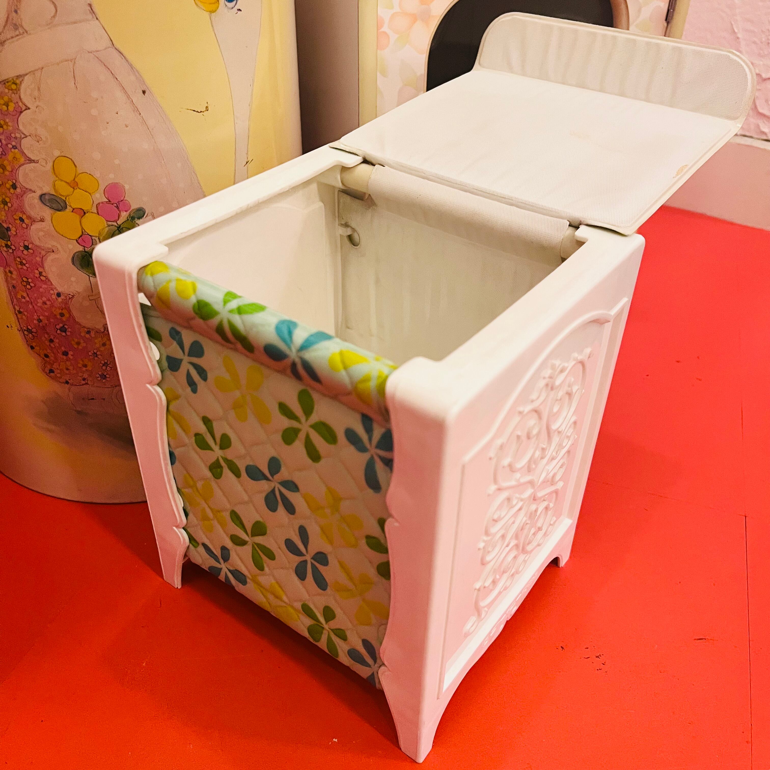 キルティングのようなステッチに爽やかな花柄、側面のプラスチックのカットや脚の形も可愛いです