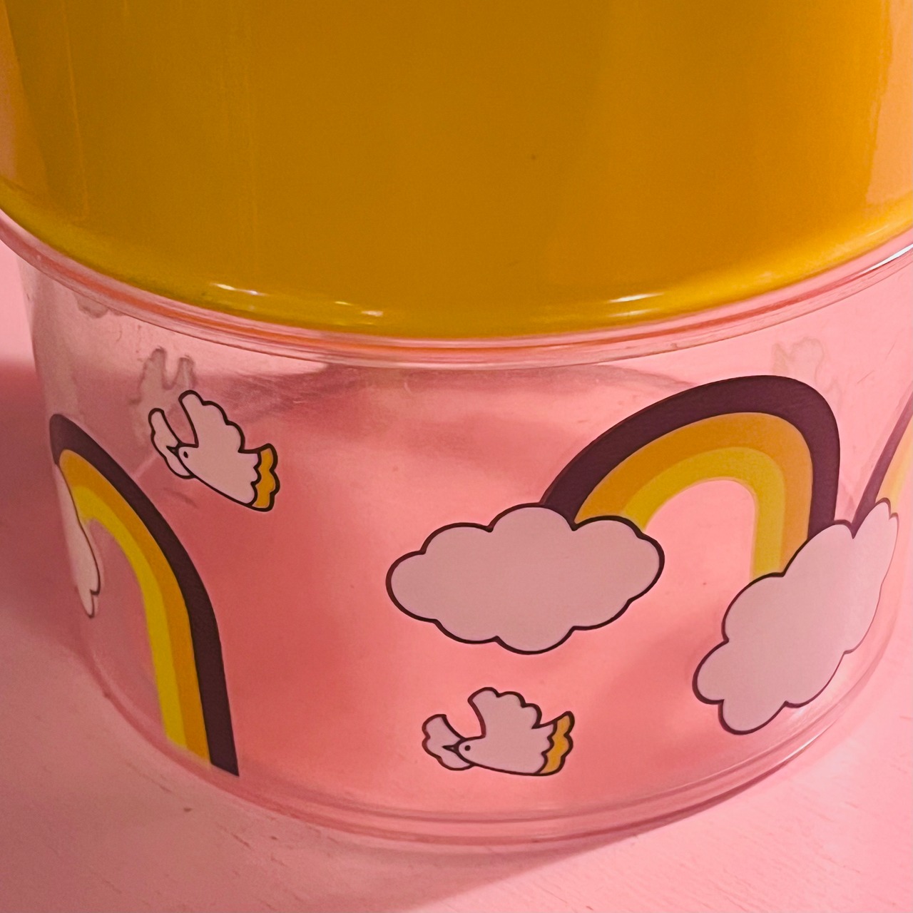 虹と鳥さんのデザインがポップで楽しいプラスチック製のキャニスター