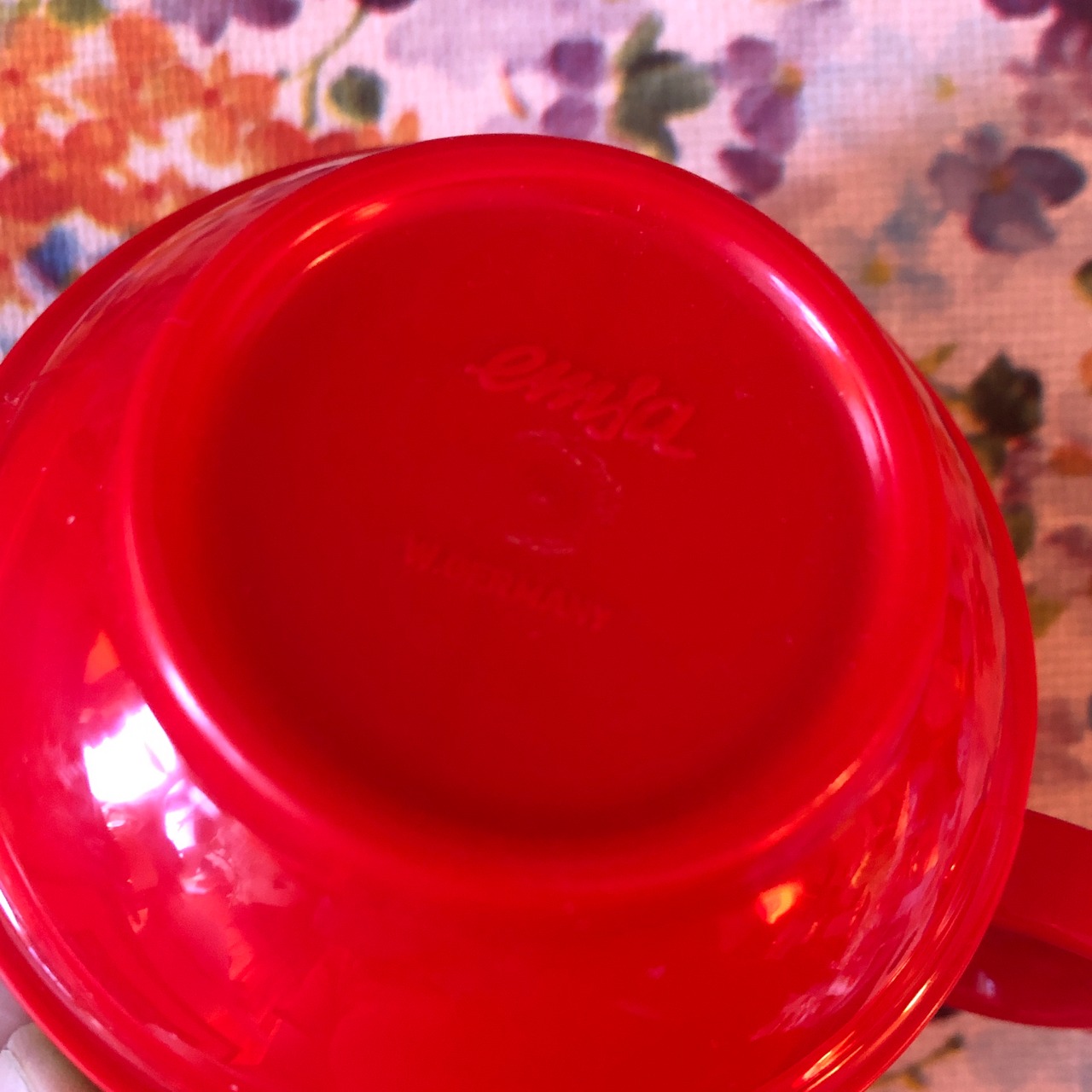 プラスチック製でままごとみたいな可愛いカップアンドソーサー。耐熱かどうかは不明です。
