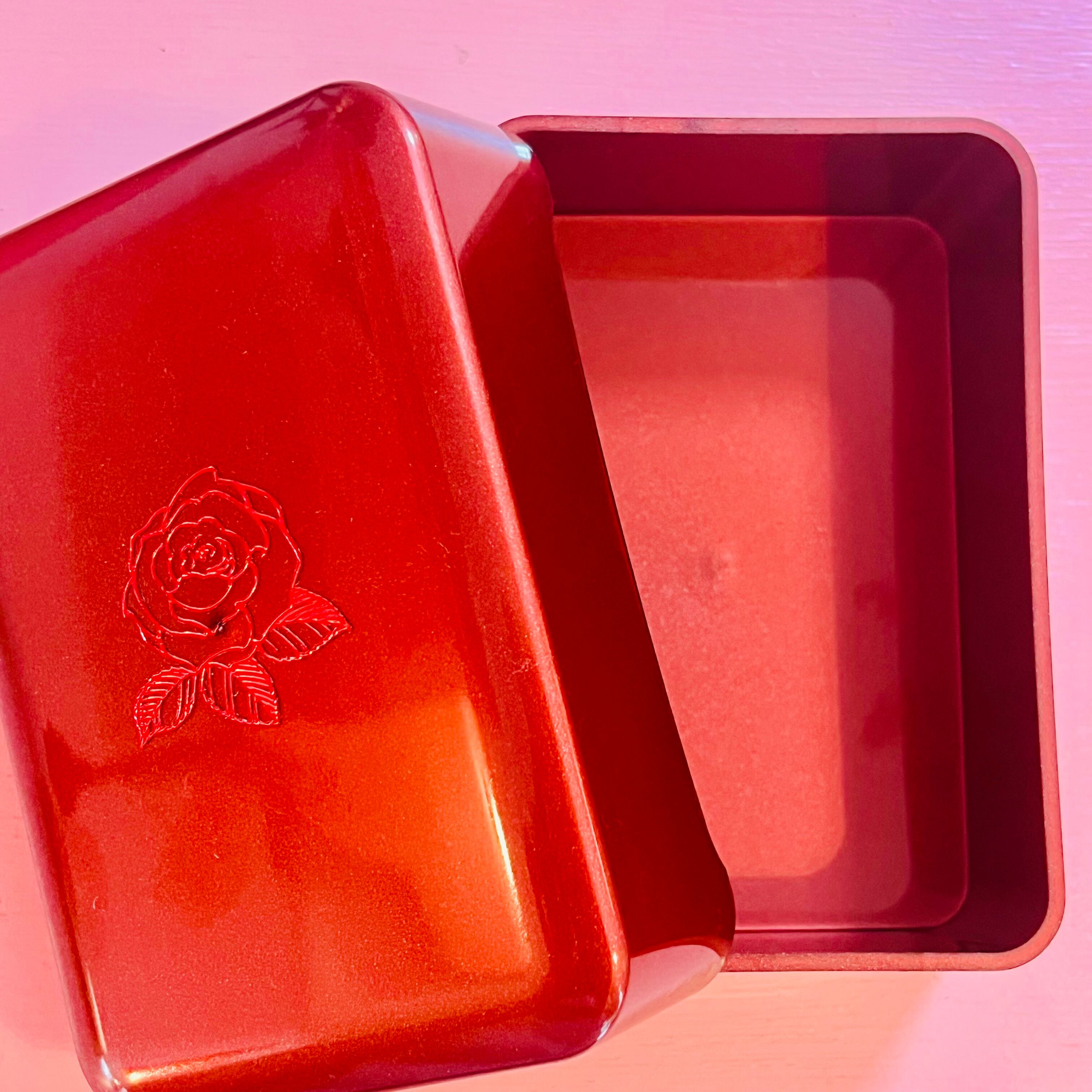 メタリックな赤に薔薇の模様がついたプラスチックケース。デッドストック品。