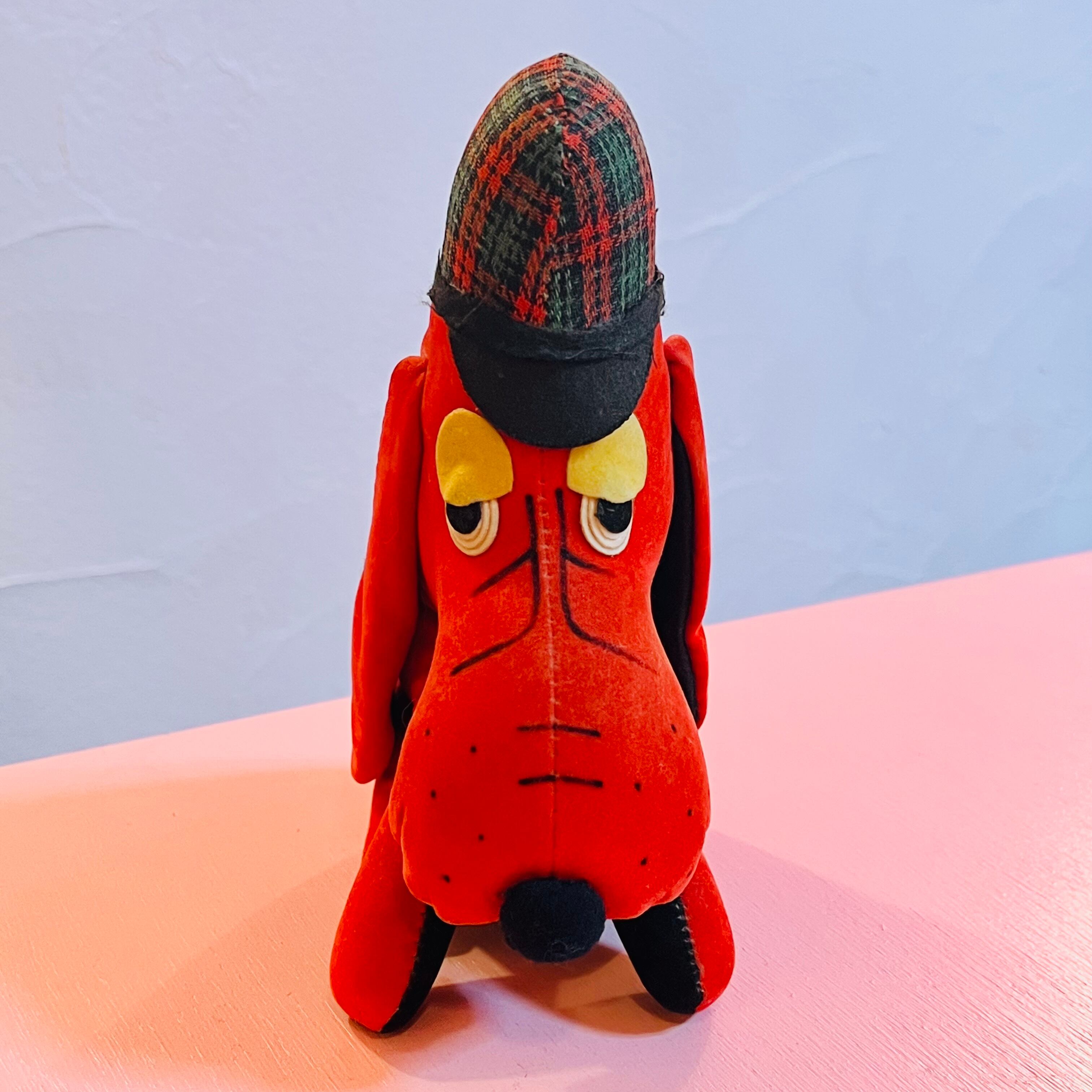 お洒落なチェックの帽子を被った赤いわんちゃん。